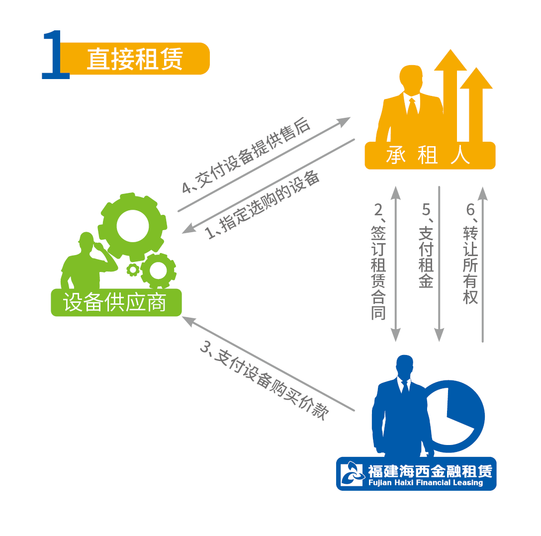 產(chǎn)品定義:海西金租根據(jù)承租人對(duì)租賃物和供應(yīng)商的選擇,向供應(yīng)商購(gòu)買選定設(shè)備,提供給承租人使用 , 承租人按期支付租金的業(yè)務(wù)模式,租賃期滿后,設(shè)備歸承租人所有。